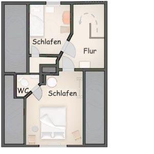 mit den zwei Schlafräumen ist über die Treppe vom Eingangsbereich aus erreichbar.